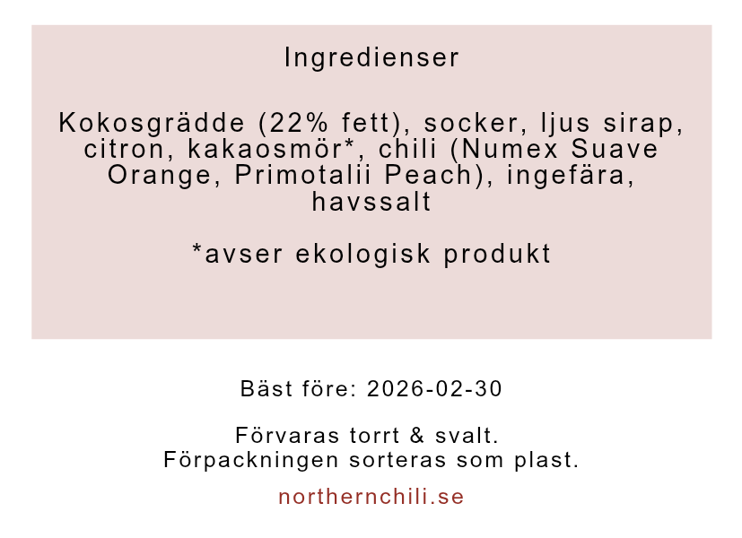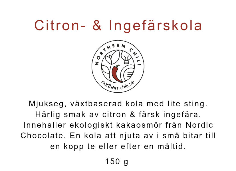 Mjukseg, växtbaserad kola med lite sting. Härlig smak av citron & färsk ingefära. Innehåller ekologiskt kakaosmör från Nordic Chocolate. En kola att njuta av i små bitar till en kopp te eller efter en måltid.