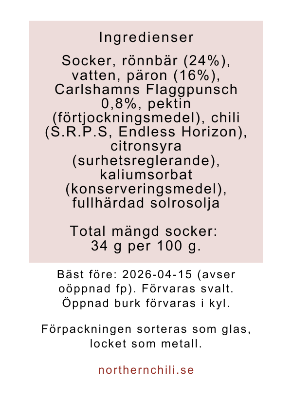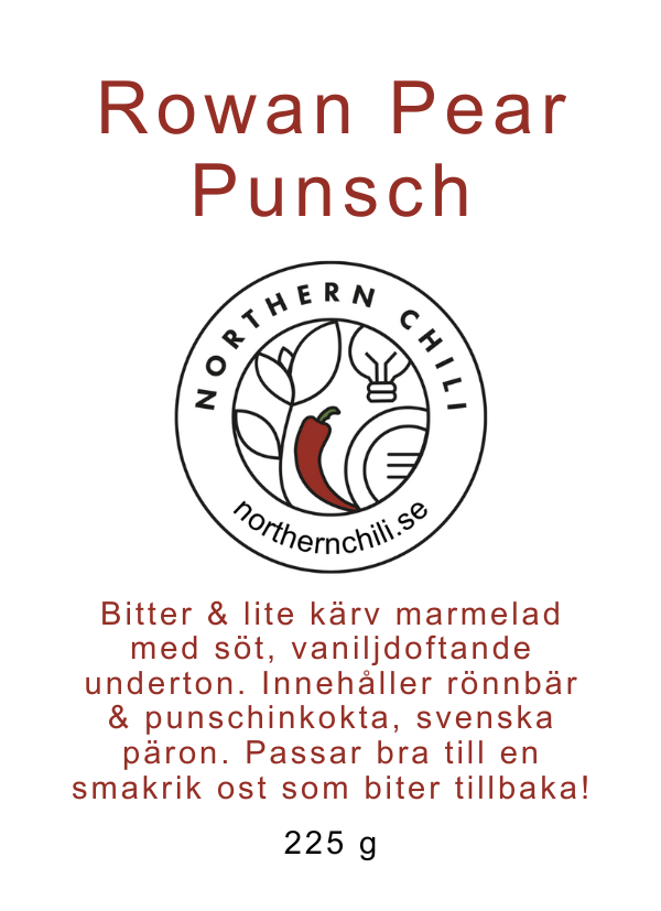 Bitter & lite kärv marmelad med söt, vaniljdoftande underton. Innehåller rönnbär & punschinkokta, svenska päron. Passar bra till en smakrik ost som biter tillbaka. Funkar även bra till en bit viltkött eller grillad portabello.