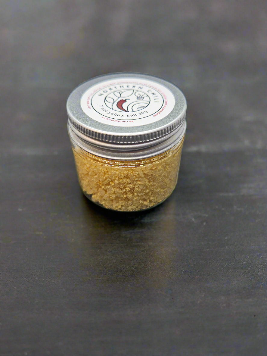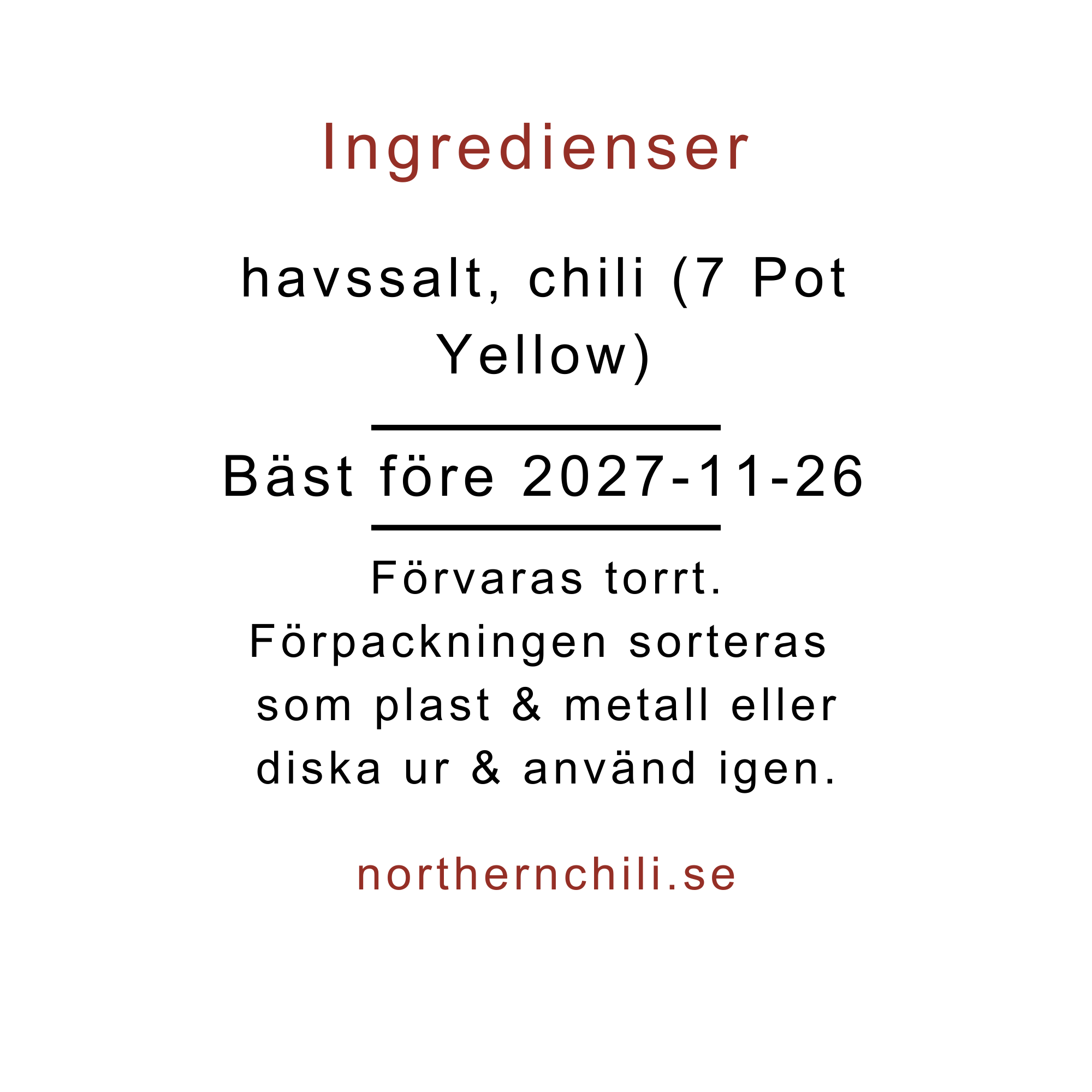 7 Pot Yellow är en riktigt het och smakrik chili med vackert gul färg. Saltet är hett men gott till grytor, sallader, bordskrydda eller varför inte strössla över kolakakorna. Innehåller endast havssalt och chili.