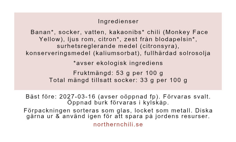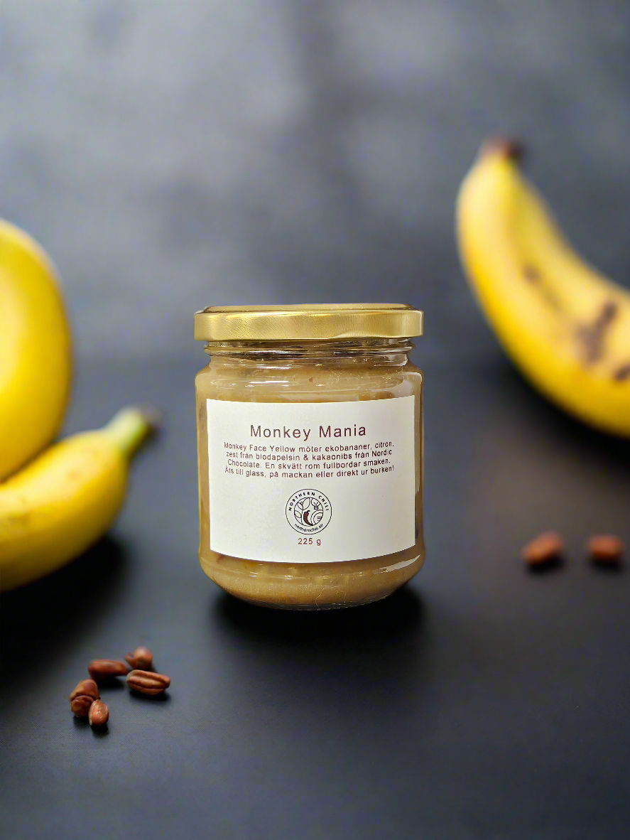 Monkey Face Yellow möter ekobananer, citron, zest från blodapelsin & kakaonibs från Nordic Chocolate. En skvätt rom fullbordar smaken. Äts till glass, på mackan eller direkt ur burken!