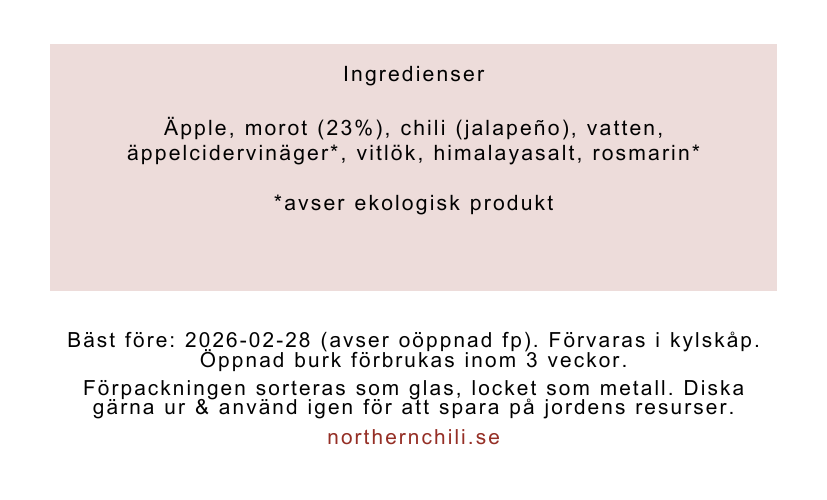 Äpplebaserad, bredbar röra baserad på främst svenska äpplen, grönsaker & örter. Denna spread innehåller morot, vitlök, samt rosmarin och har en mild chilihetta.