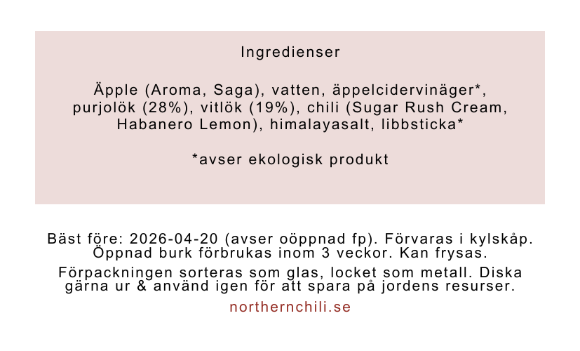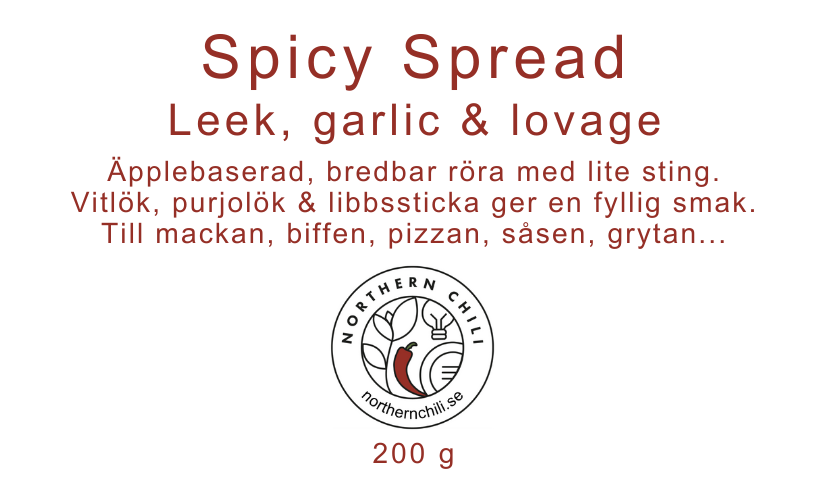 Äpplebaserad, bredbar röra med lite sting. Vitlök, purjolök & libbssticka ger en fyllig smak. Till mackan, biffen, pizzan, såsen, grytan....