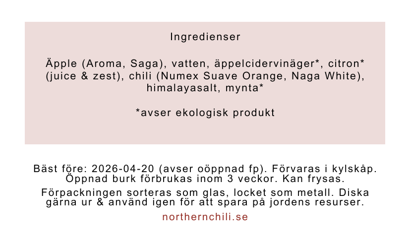 Äpplebaserad, bredbar röra med lite sting. En aning citron samt mynta ger en fräsch smak som passar till allt från efterätter till lamm & grytor.